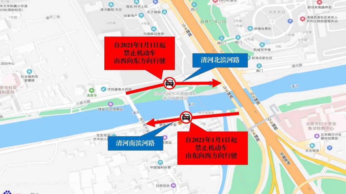 2021年1月1日起,海淀区清河北滨河路(清河四街水桥至G6辅路)禁止机动车由西向东方向行驶;清河南滨河路(清河四街水桥至G6辅路)禁止机动车由东向西方向行驶。