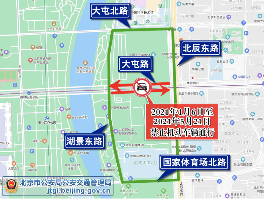 2021年1月6日至2021年5月21日期间,大屯路(湖景东路—北辰东路)禁止机动车辆通行,过往机动车辆可绕行湖景东路、大屯北路、北辰东路、国家体育场北路等周边道路通行。