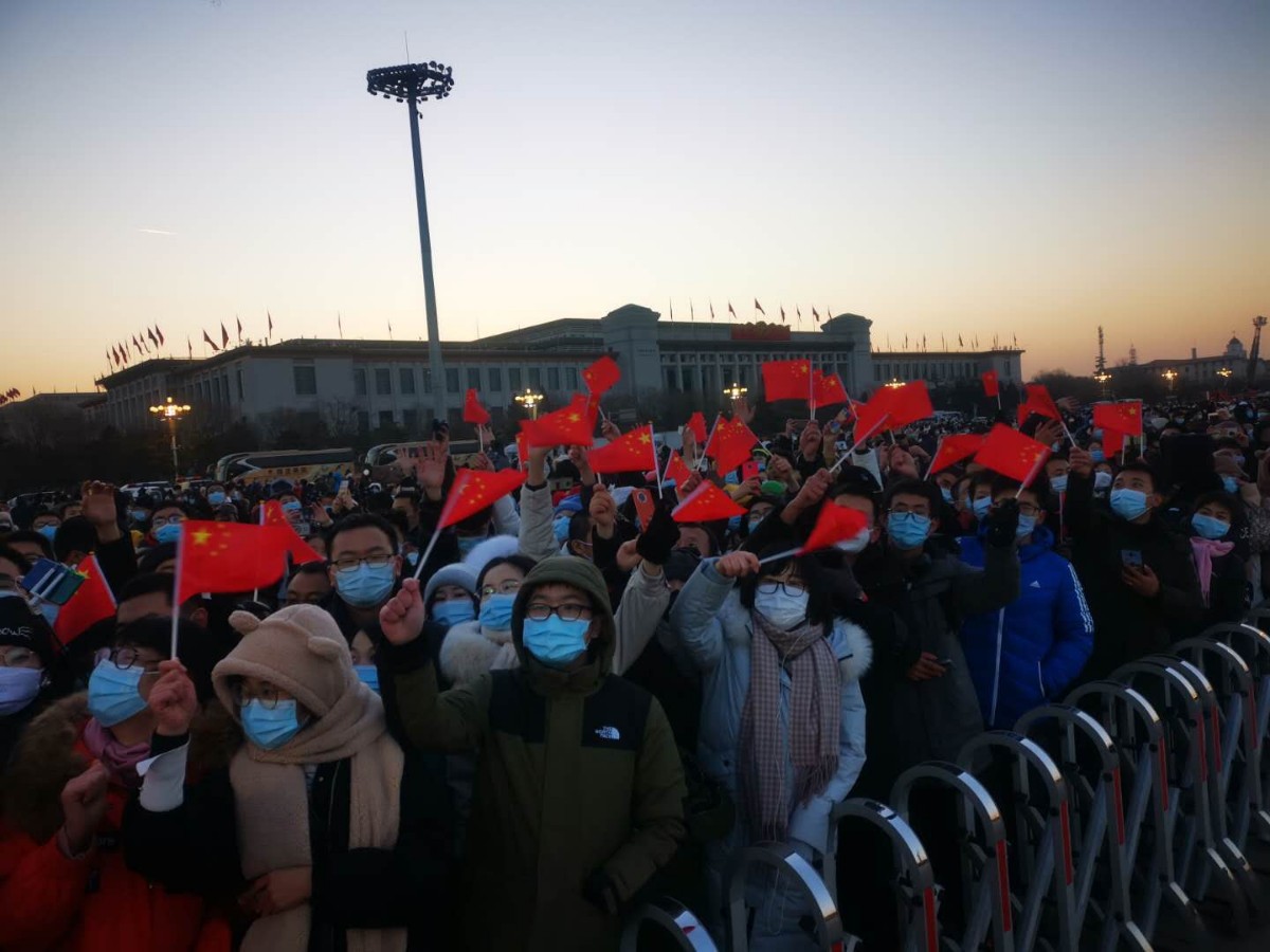 早上6点多,天还没亮,户外温度已跌至零下10度之下,但寒冷的天气丝毫没有影响大家的热情。大家戴着口罩,裹紧衣服,有的挥舞着小红旗,有的不时地跺跺脚、搓搓手,在广场周围静静等待。还有不少人以天安门广场为背景,用手机自拍记录下这个特别的清晨。
