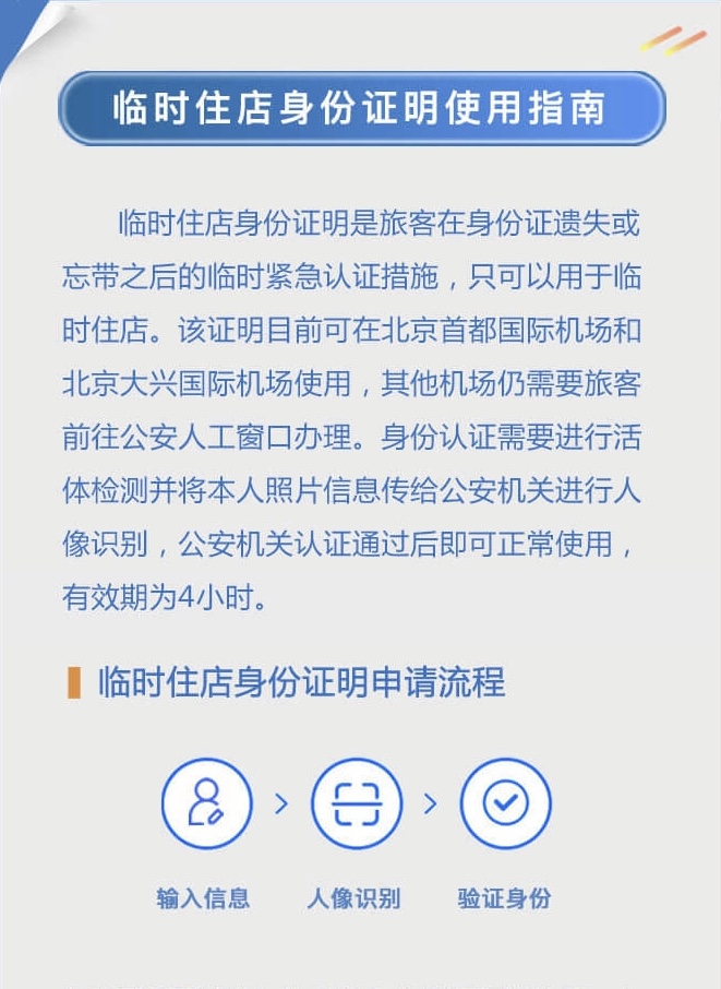 “国门公安APP”2020年10月,功能上新,其中包括“临时住店身份证明”功能。在北京首都国际机场、北京大兴国际机场区域住店却发现身份证遗失、忘带的旅客,原来至少需要四公里的跑腿距离,现在拿着手机一抬手就能解决。据悉,该功能上线3个月来,已累计为旅客办理业务1400余次。