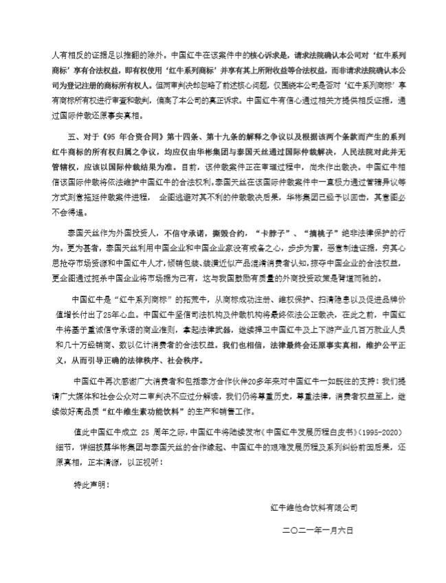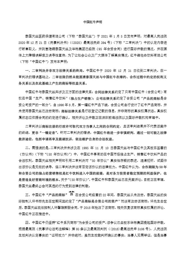 对此,红牛维他命饮料有限公司(以下简称“华彬红牛”)于2021年1月6日发表声明称,泰国天丝医药保健有限公司(下称“泰国天丝”)于2021年1月5日发布声明,对最高人民法院2020年12月21日《民事判决书》((2020)最高法民终394号)(下称“二审判决”)中的认定内容断章取义,并刻意隐瞒了泰国天丝及华彬集团已经就《95年合资合同》进行国际仲裁的情况。