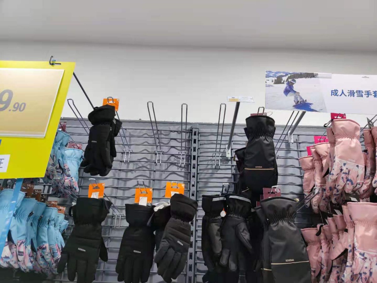 店内兼具保暖和防水性能的滑雪手套已空了七个展架,售价为14.9元的粉红色儿童手套也只剩下两双,两款羊毛材质、摇粒绒内衬的帽子也空了两个展架。“这两天大降温,买的人多,有的款式和码数都卖断货了。”一旁的售货员介绍说。