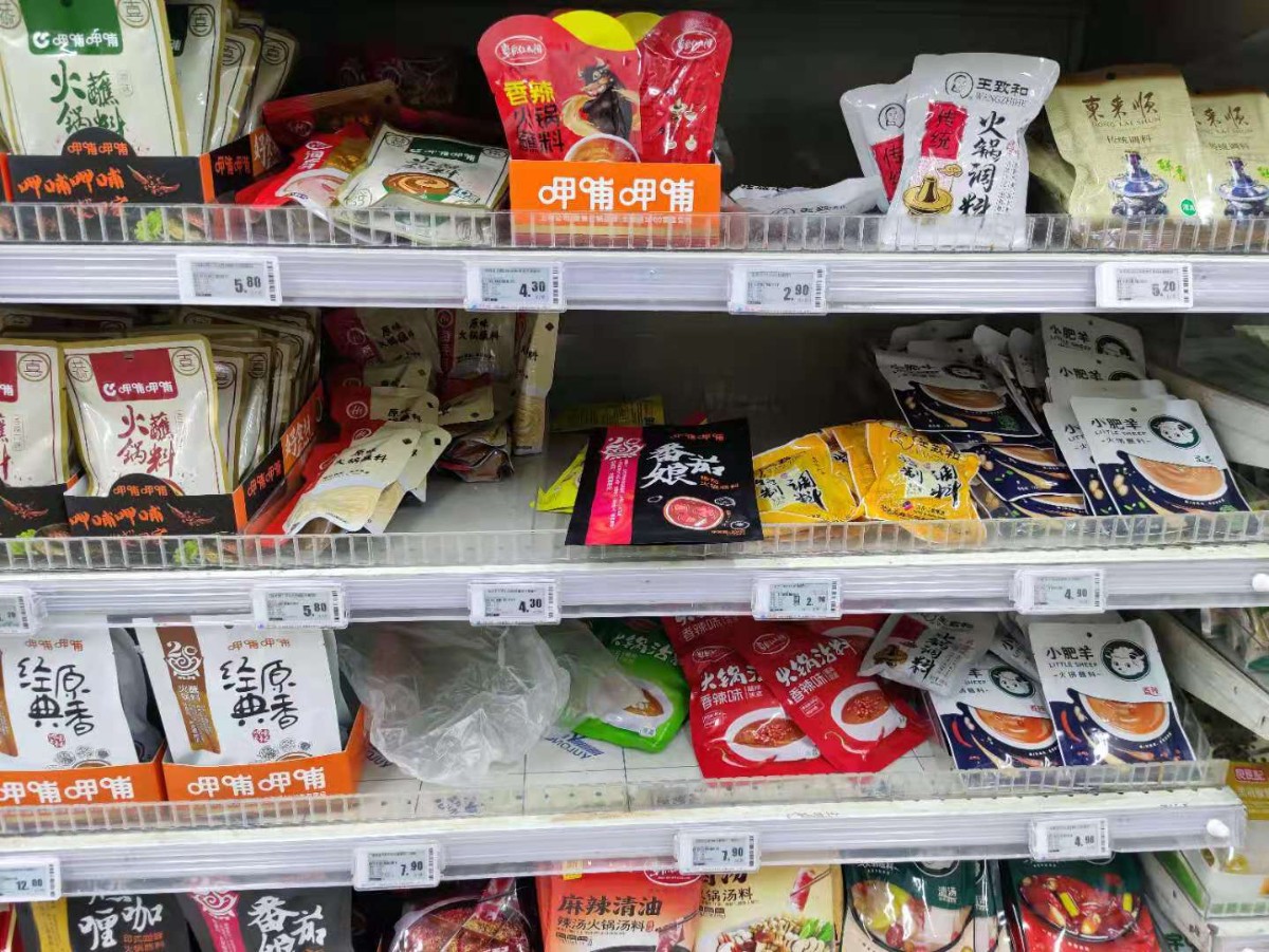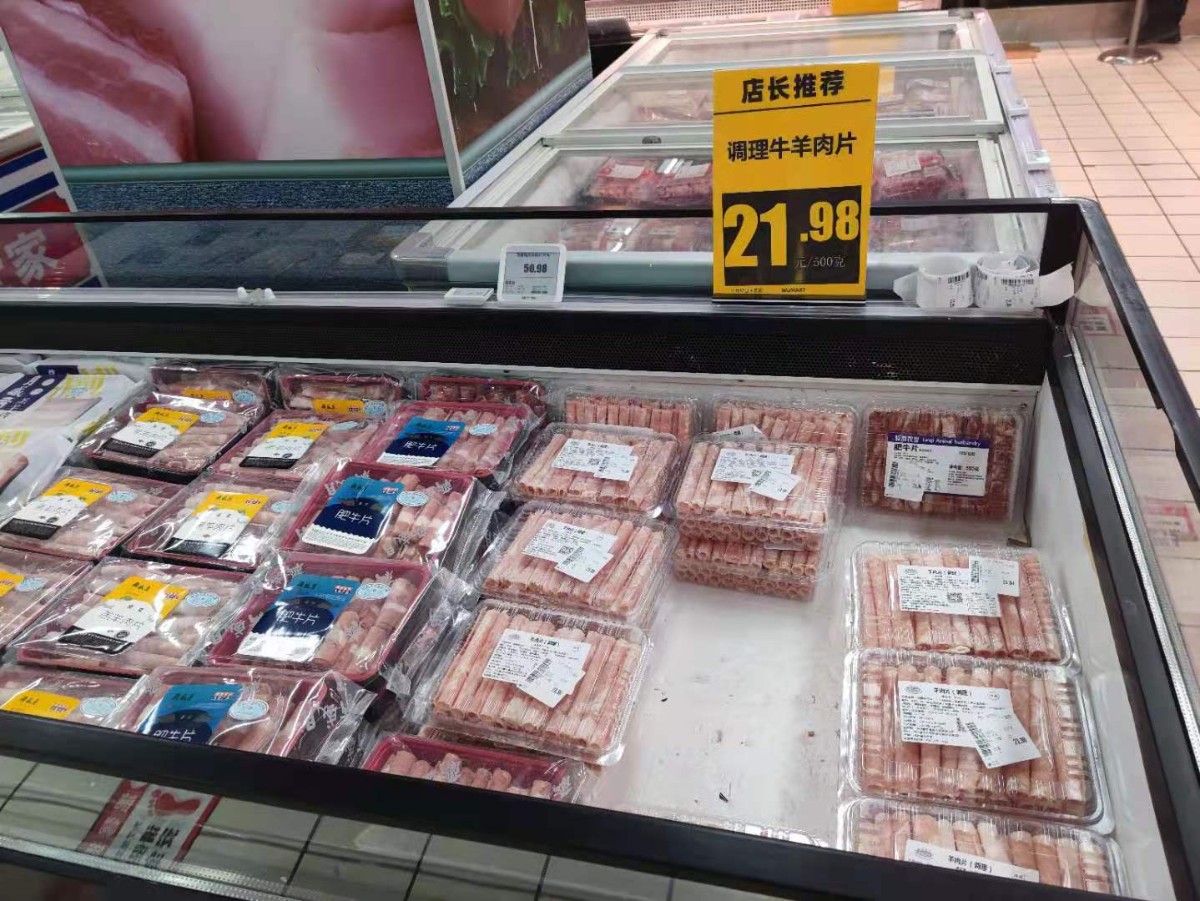 外面天寒地冻,吃上满头大汗、热气腾腾的火锅能给人带来不少暖意。火锅食材、底料、蘸料也随着强冷空气的到来走俏。在中关村的物美超市,冰柜中打着“店长推荐”标签的“调理牛羊肉片”已空了四分之一,调料区的火锅底料、蘸料货架也空了不少。刘女士的购物车里,放着她选好的三盒牛羊肉、一袋火锅丸、青菜、火锅底料、蘸料,准备和家人一起吃顿火锅。刘女士说:“最近天冷,朋友们约饭十有八九也都是吃火锅。疫情还没过去,自己购买食材煮火锅,又安全又便宜。”