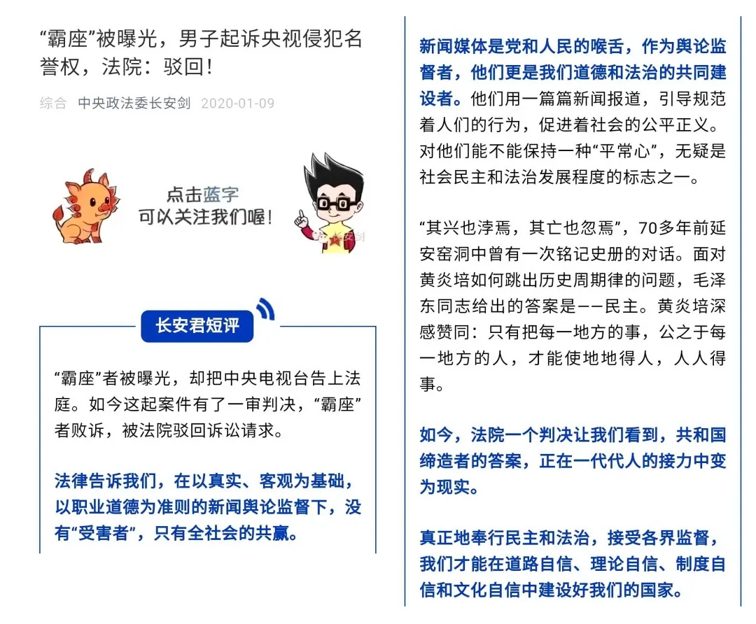 对此,“中央政法委长安剑”评论认为:法律告诉我们,在以真实、客观为基础,以职业道德为准则的舆论监督下,没有“受害者”,只有全社会的共赢。