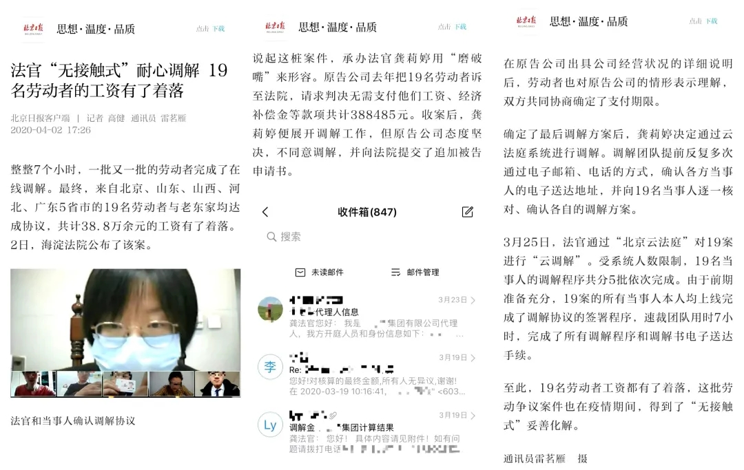 去年3月25日,海淀法院通过“北京云法庭”对劳动争议纠纷19案成功主持“云调解”。19名劳动者分别来自北京、山东、山西、河北、广东5省市,涉及工资38.8万余元。