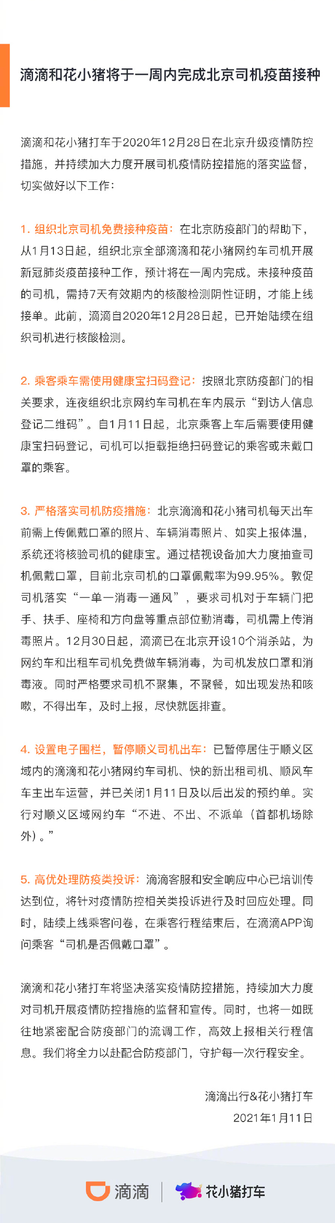 1. 组织北京司机免费接种疫苗:在北京防疫部门的帮助下,从1月13日起,组织北京全部滴滴和花小猪网约车司机开展新冠肺炎疫苗接种工作,预计将在一周内完成。未接种疫苗的司机,需持7天有效期内的核酸检测阴性证明,才能上线接单。此前,滴滴自2020年12月28日起,已开始陆续在组织司机进行核酸检测。