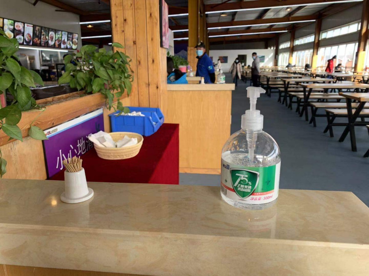 进入雪具大厅后,记者注意到,无论是租赁雪具的柜台、结账处还是二楼餐厅,随处摆放着一瓶瓶免费供顾客使用的75%乙醇免洗洗手液。“我们会不断提醒顾客佩戴口罩、随时进行手部消毒,排队时要保持一米间距,注意防控疫情。”大厅和室外的广播,也在循环播放着防疫注意事项和温馨提醒。