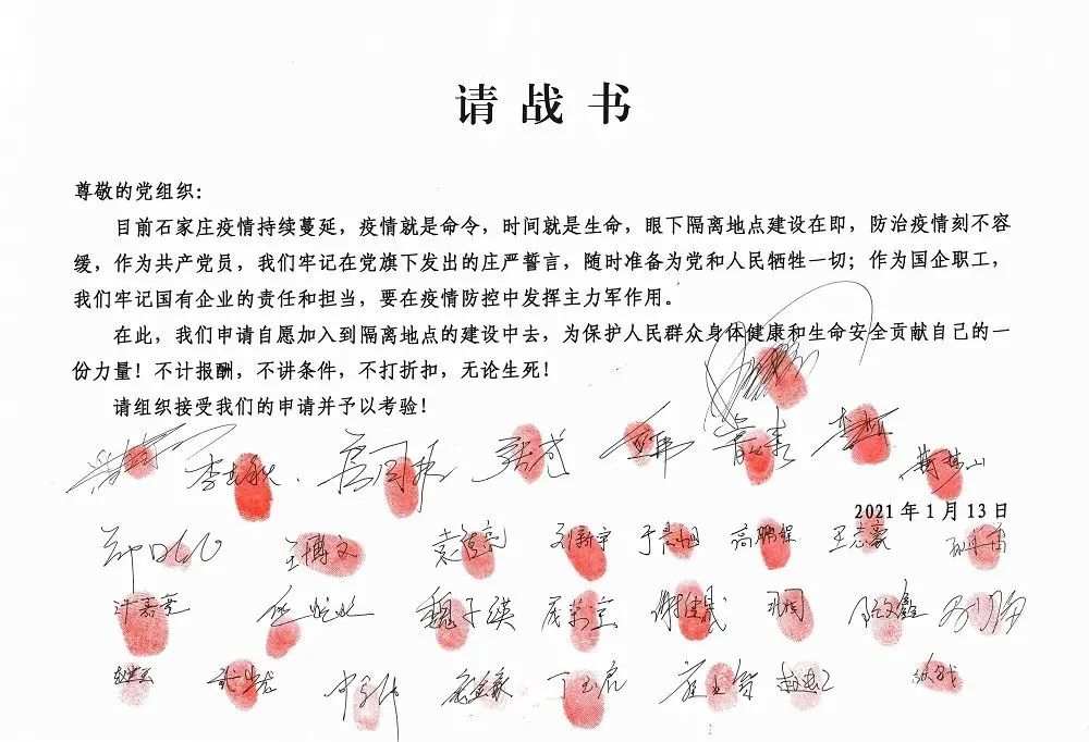 1月13日得知石家庄市集中隔离点建设的消息后,中国铁建所属中铁十四局滹沱河项目全员签下请战书。