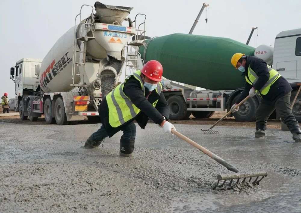 1月14日,中国铁建建设工人在石家庄市集中隔离点建设工地硬化地面。