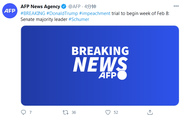 法新社刚刚消息,参议院多数党领袖舒默称,特朗普弹劾案审讯将于2月8日开始。