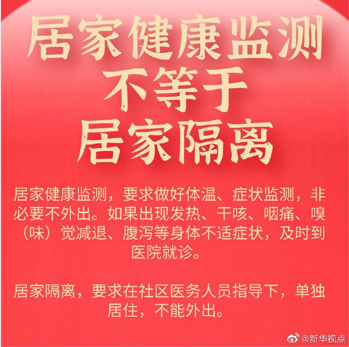 居家健康监测,要求做好体温、症状监测,非必要不外出。如果出现发热、干咳、咽痛、嗅(味)觉减退、腹泻等身体不适症状,及时到医院就诊。居家隔离,要求在社区医务人员指导下,单独居住,不能外出。
