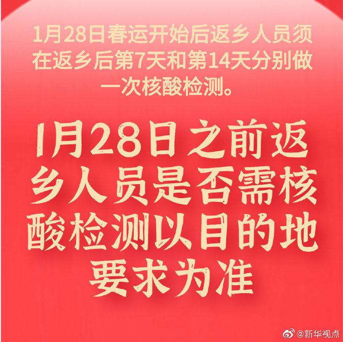 1月28日春运开始后返乡人员须在返乡后第7天和第14天分别做一次核酸检测。1月28日之前返乡人员是否需核酸检测以目的地要求为准。