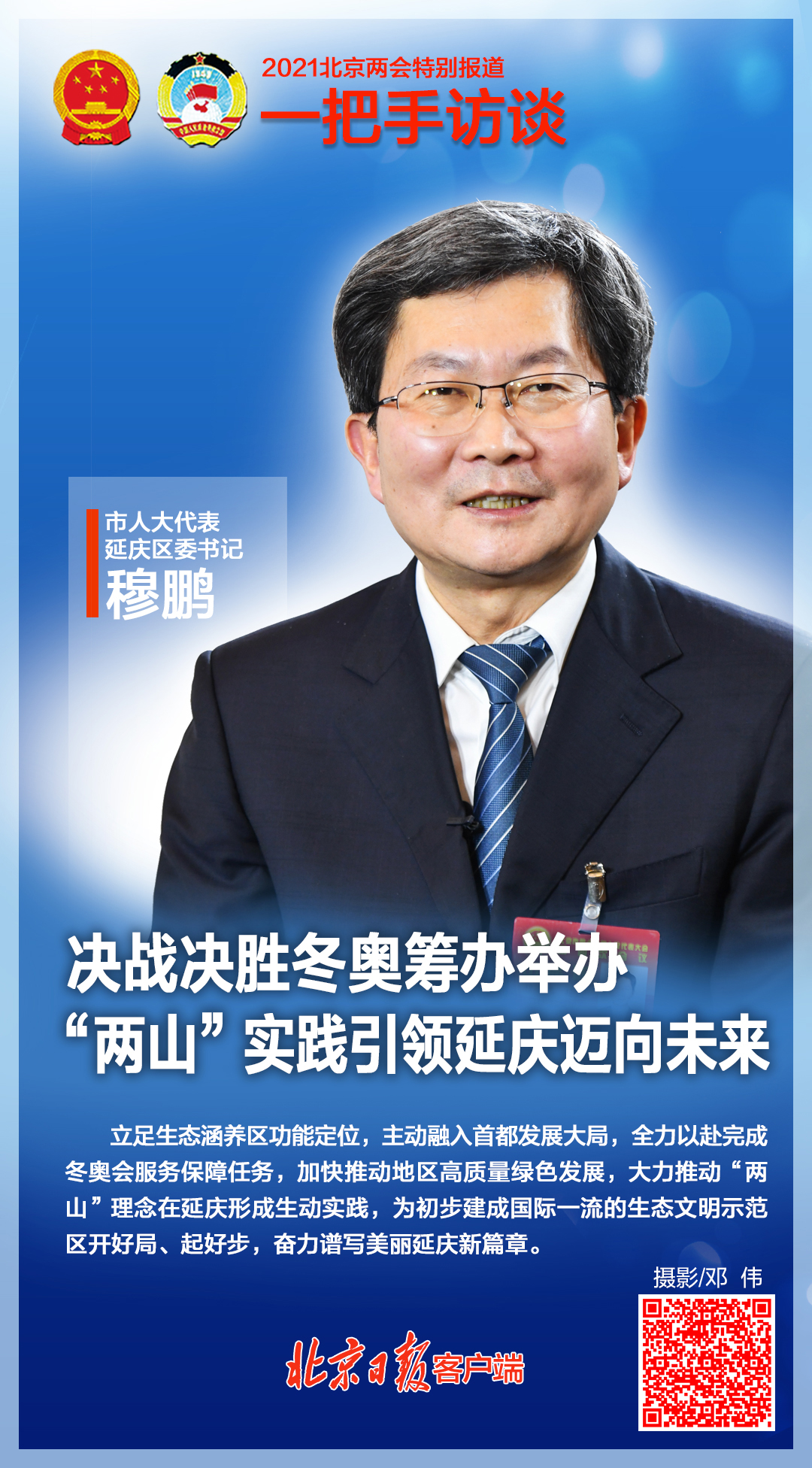 1月23日傍晚,北京市人大代表、延庆区委书记穆鹏做客北京日报客户端“一把手访谈”栏目,介绍了延庆区在生态涵养、筹办举办世园会和冬奥会、科技创新、城市治理等方面取得的成就,以及2021年延庆区的重点工作、冬奥会筹办计划,并展望了“十四五”期间延庆的发展。穆鹏表示,“十四五”时期是延庆交出冬奥会服务保障和地区高质量绿色发展两张优异答卷的决胜时期。延庆立足生态涵养区功能定位,主动融入首都发展大局,全力以赴完成冬奥会服务保障任务,加快推动地区高质量绿色发展,大力推动“两山”理念在延庆形成生动实践,为初步建成国际一流的生态文明示范区开好局、起好步,奋力谱写美丽延庆新篇章。