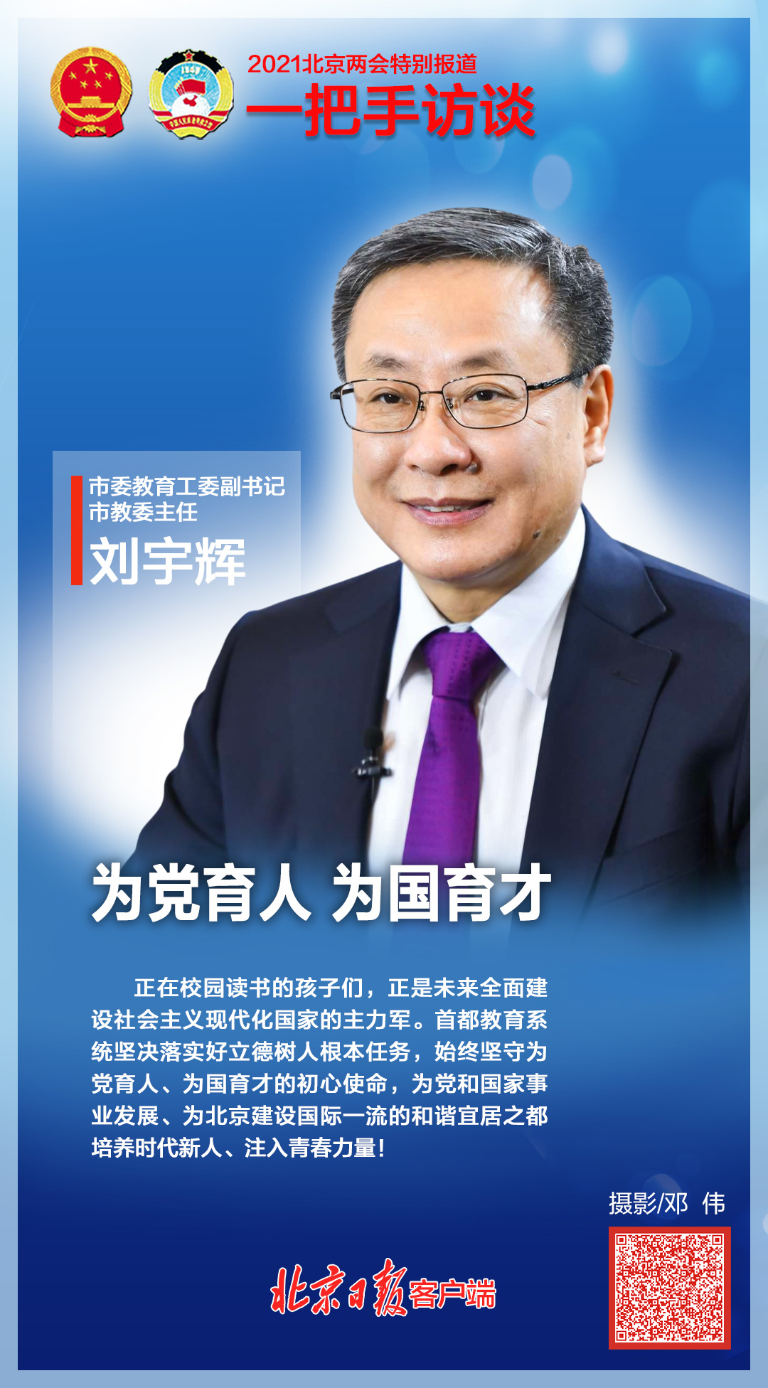 1月25日,市委教育工委副书记、市教委主任刘宇辉做客北京日报客户端“一把手访谈”栏目。刘宇辉表示,正在校园读书的孩子们,正是未来全面建设社会主义现代化国家的主力军。首都教育系统坚决落实好立德树人根本任务,始终坚守为党育人、为国育才的初心使命,为党和国家事业发展、为北京建设国际一流的和谐宜居之都培养时代新人、注入青春力量!