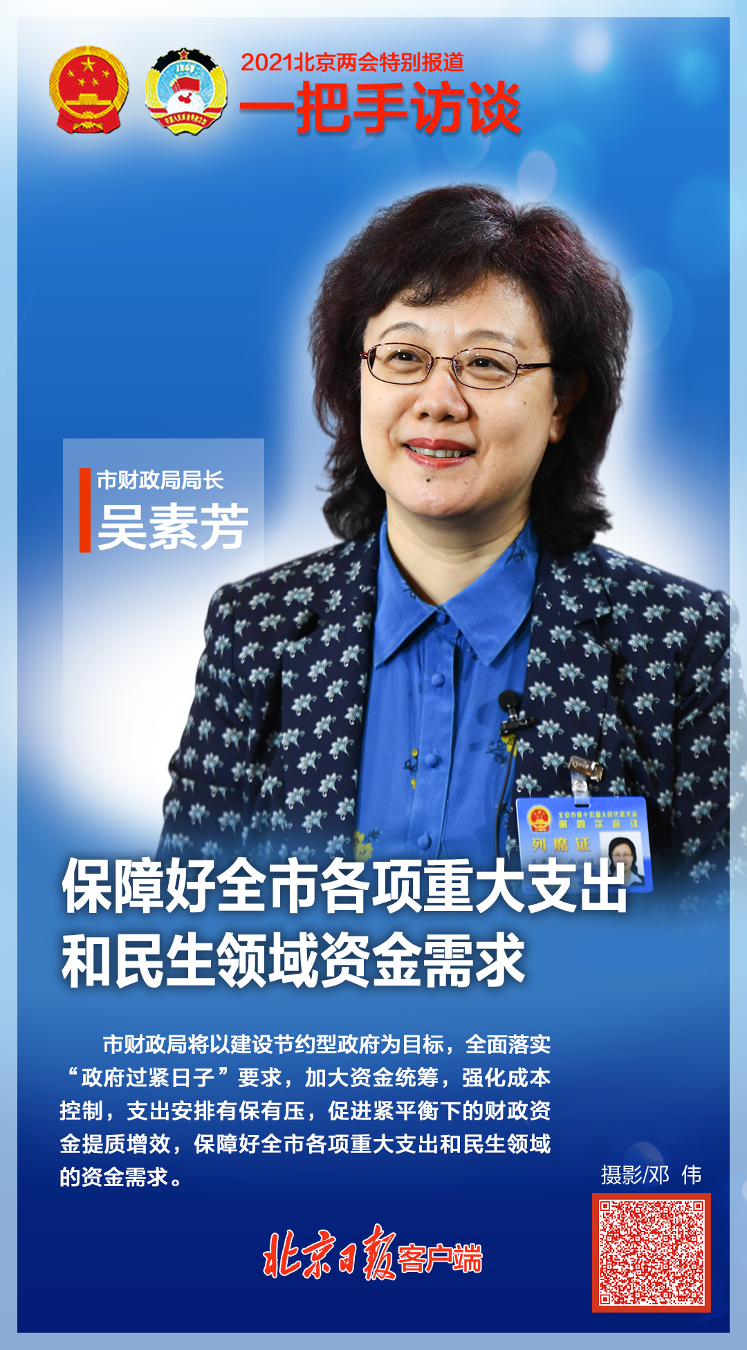 1月24日,北京市财政局局长吴素芳做客北京日报客户端“一把手访谈”栏目,吴素芳说,市财政局将以建设节约型政府为目标,全面落实“政府过紧日子”要求,加大资金统筹,强化成本控制,支出安排有保有压,促进紧平衡下的财政资金提质增效,保障好全市各项重大支出和民生领域的资金需求。