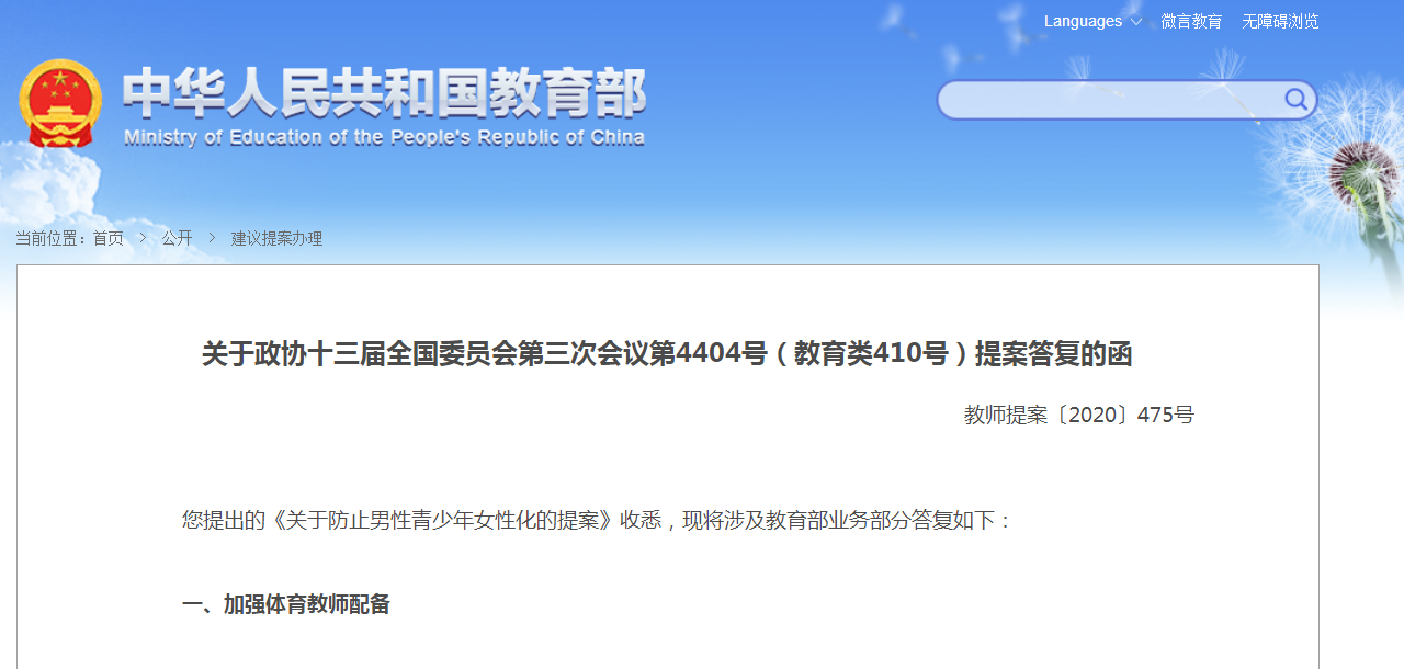 您提出的《关于防止男性青少年女性化的提案》收悉,现将涉及教育部业务部分答复如下: