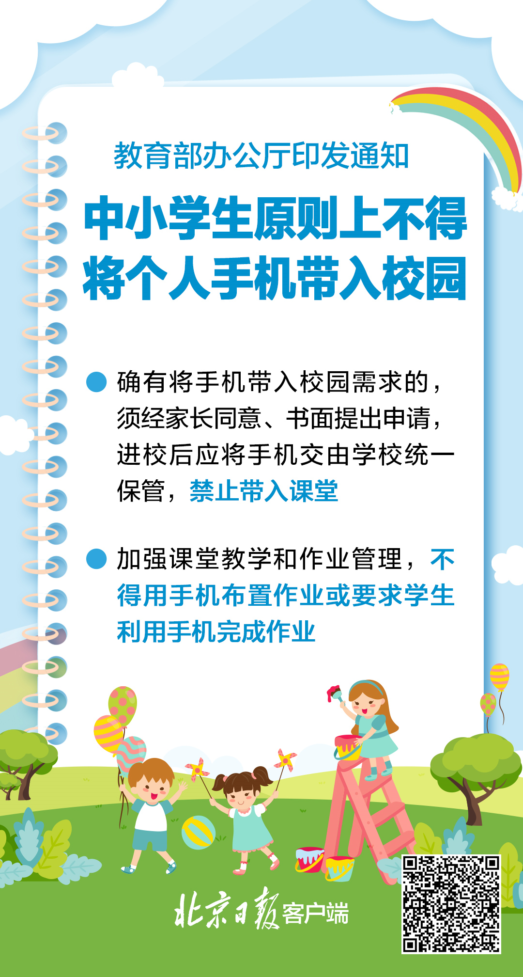 《通知》明确,学校应当告知学生和家长,原则上不得将个人手机带入校园。学生确有将手机带入校园需求的,须经学生家长同意、书面提出申请,进校后应将手机交由学校统一保管,禁止带入课堂。