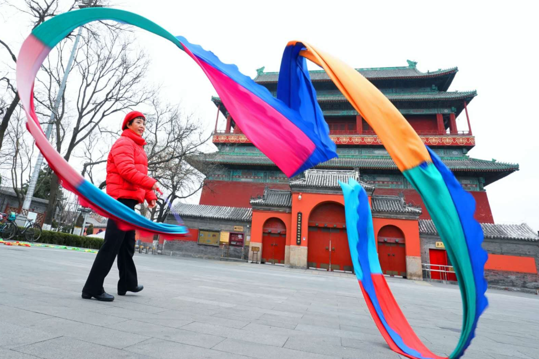2月3日,在钟鼓楼广场,北京市民饶有兴致的舞动起彩色的缎带,迎接万物复苏,气象更新的春天。北京日报客户端记者 方非/摄