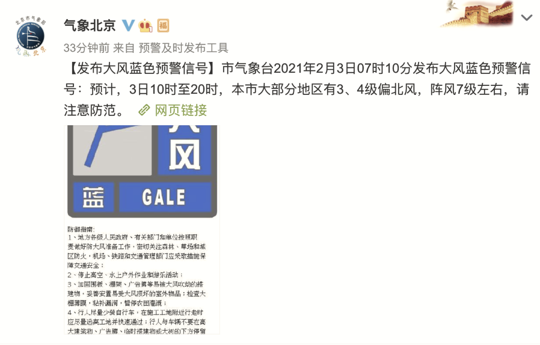 发布大风蓝色预警信号: