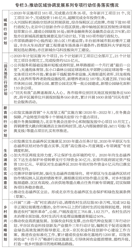 协同发展重点任务加快落实。交通一体化建设取得新进展,京沈客专基本具备开通条件,轨道交通平谷线复工建设。大兴国际机场北线高速东延段达到通车条件,G105国道等工程基本完工,环首都“一小时交通圈”逐步扩大。生态环境协同治理持续深化,三地同步发布实施机动车和非道路移动机械排放污染防治条例,京津风沙源治理二期造林1万亩,永定河以水开路、用水引路生态治水模式成功实施,北京段25年来首次全线通水。产业对接和创新协作大力推进,京津冀国家技术创新中心建设方案获批,中关村企业在津冀设立分支机构累计达8600余家,北京流向津冀技术合同成交额347亿元、增长22.7%。