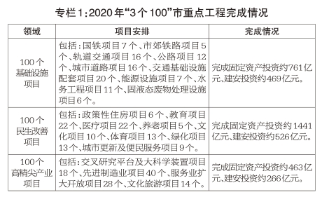 2020年31项计划指标中27项完成年初计划目标,经市十五届人大常委会第二十六次会议批准,地区生产总值增速目标由6%左右调整为正增长,一般公共预算收入增速目标由零增长调整为下降6%左右,中心城区绿色出行比例目标由75%调整为72%,单位地区生产总值建设用地使用面积降幅目标由4.36%调整为1%左右,这4项指标均完成调整后目标。就业、价格等指标保持在合理区间,创新驱动、资源节约、生态环境保护等反映高质量发展指标继续改善。
