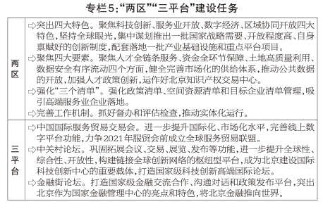 加快“两区”“三平台”建设。统筹推进“两区”251项开放改革举措,健全实体化运行机制,坚持清单化管理、项目化推进,尽快形成可视化效果,推动“两区”与“三城一区”、商务中心区、金融街等联动创新,努力打造改革开放“北京样板”。(1)强化制度和政策创新。推出北京自贸试验区制度创新清单,落实全国版跨境服务贸易负面清单,注意防范风险,做好实施负面清单后的监管。制定实施“两区”建设分区工作方案和各片区组团实施方案,推动天使投资、创业投资税收与投资年限反向挂钩等6项税收突破性政策落地,加快建设国际信息产业和数字贸易港,试点跨境数据流动,打造海淀、朝阳、大兴三个数字贸易试验区。(2)抓好自贸区三个片区建设。科技创新片区推动实施技术转让所得税优惠政策,在软件实名认证、数据产品进出口等方面先行先试;国际商务片区探索消费、预办登机一体化试点,在首都国际机场周边打造功能完善的组团式会展综合体;高端产业片区吸引一批战略性新兴产业和国际高端功能机构落地,申报亦庄综合保税区。(3)挖掘双枢纽发展优势。实施“再造国门”计划,推进首都国际机场南货机坪、公务机楼迁建等项目建设,大兴机场综保区一期实现封关运行。依托国家物流枢纽建设,发展国际航空物流。加快中日、中德国际创新合作园区建设。(4)擦亮开放金字招牌。办好中国国际服务贸易交易会,组建全球服务贸易联盟。高水平举办中关村论坛,做优做强技术交易板块。完善金融街论坛举办机制,着力提升国际影响力。建设高层次云端国际交流合作平台。扎实推进雁栖湖国际会都提质升级、国家会议中心二期、第四使馆区等重大项目建设。