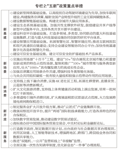 着力建设全球数字经济标杆城市。制定实施促进数字经济创新发展行动纲要,加快产业数字化、数字产业化,率先打造具有国际竞争力的数字产业集群。(1)下好新型信息基础设施建设“先手棋”。推广应用千兆固网、IPv6,布局卫星互联网、工业互联网,推进国家级工业互联网示范基地、国家网络安全产业园建设。建立人工智能算力算法数据一体化开放服务平台,推进技术超前、规模适度的边缘计算节点建设。支持自主可控的区块链专用芯片和底层技术发展。实施超高清产业行动计划,构建全国领先的8K超高清产业集群,积极开展5G+8K应用示范。(2)实施应用场景“十百千”工程。在城市副中心、“三城一区”等重点区域再推出一批示范项目。推进高级别自动驾驶示范区建设,不断丰富高速公路等自动驾驶测试应用场景。建设国家北斗创新应用综合示范区,促进北斗在智能网联汽车、无人机等领域深度应用。(3)推进传统产业数字化赋能。加快传统制造装备联网、关键工序数控化等改造,大力发展无人制造、柔性制造。培育一批面向中小企业的数字化服务商。(4)制定实施智慧城市发展行动纲要。布局城市全域应用场景,构建标准化的城市基础信息编码体系,打造“时空一张图”数字底座,提供统一的地理空间数据共享服务。完善政府与社会数据共享规则和标准体系。启动教育、医疗等行业云建设,推动数字教育资源共建共享,建设互联网医疗监管平台。完善市级大数据平台,推进交通、能源、环保等城市运行管理“一网统管”,提升公共服务、社会治理数字化水平。研究制定供热系统智能化推进方案,积极推进智能供热改造试点。充分保障在运用智能技术方面遇到困难的老年人基本需求。