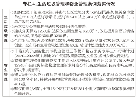 基层治理创新继续深化。持续推动“吹哨报到”“接诉即办”改革创新,形成超大城市治理“北京模式”,12345市民服务热线解决率、满意率分别上升到86.4%和91.8%。制定新时代爱国卫生运动三年行动方案,广泛开展周末卫生日等活动,小巷管家、“回天有我”、《向前一步》等共治品牌效应持续显现。制定街道办事处、社区居委会设立标准,出台撤村建居指导意见,做精做细基层治理。抓好垃圾分类和物业管理两件“关键小事”,出台居民家庭生活垃圾分类指引,开展桶、车、站、楼等全链条改造升级,强化桶前值守,加强对“混装混运”等突出问题执法检查,全市家庭厨余垃圾日均分出量较条例实施前增长12.7倍,生活垃圾回收利用率达35%;推动出台物业管理条例,全市业委会(物管会)组建率、物业服务覆盖率和党的组织覆盖率超额完成年度目标。