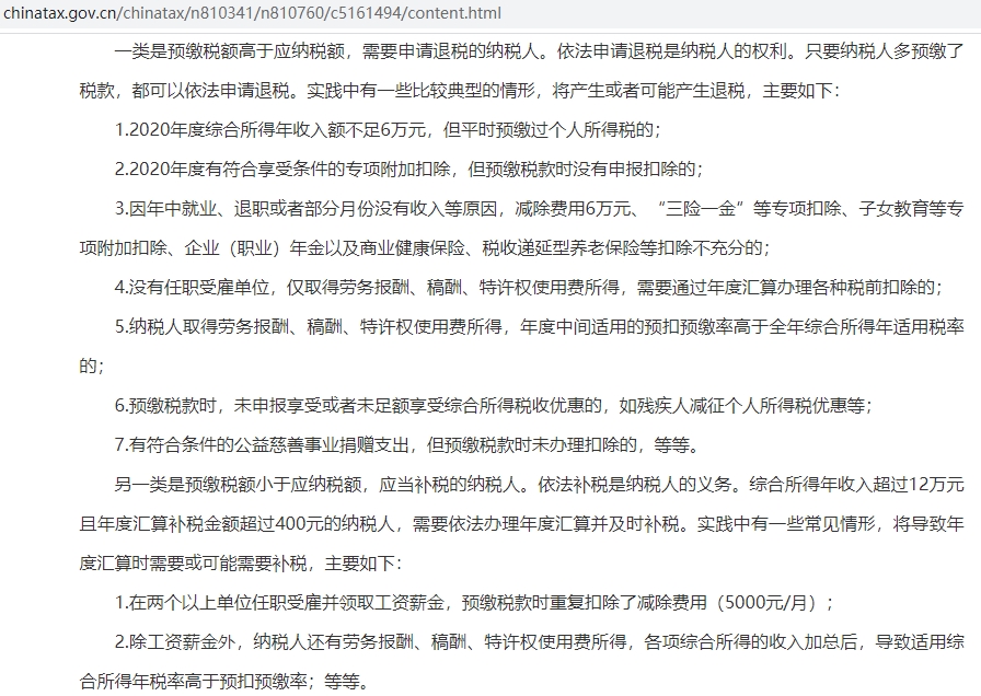 这包括了2020年度综合所得年收入额不足6万元,但平时预缴过个人所得税的;2020年度有符合享受条件的专项附加扣除,但预缴税款时没有申报扣除的;因年中就业、退职或者部分月份没有收入等原因,减除费用6万元、“三险一金”等专项扣除、子女教育等专项附加扣除、企业(职业)年金以及商业健康保险、税收递延型养老保险等扣除不充分的;没有任职受雇单位,仅取得劳务报酬、稿酬、特许权使用费所得,需要通过年度汇算办理各种税前扣除的;纳税人取得劳务报酬、稿酬、特许权使用费所得,年度中间适用的预扣预缴率高于全年综合所得年适用税率的;预缴税款时,未申报享受或者未足额享受综合所得税收优惠的,如残疾人减征个人所得税优惠等;有符合条件的公益慈善事业捐赠支出,但预缴税款时未办理扣除的等。