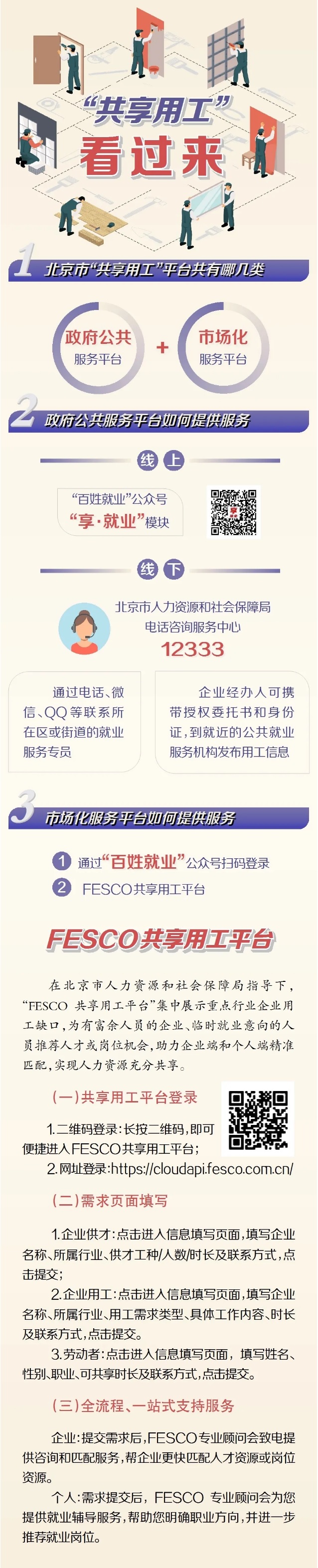 为进一步做好余缺企业之间的共享用工对接与服务工作,近日,北京市人力资源和社会保障局发布《北京市“共享用工”平台操作指南——“共享用工”看过来》,指导劳动力余缺企业在政府公共服务平台、市场化服务平台上便利操作、有效对接。