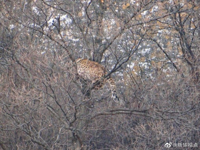 图为被困在树上的金钱豹。(山西省森林公安局吕梁山分局供图)