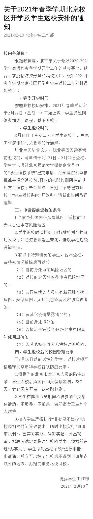 2月10日,北京师范大学发布关于2021年春季学期北京校区开学及学生返校安排的通知。通知表示,按照学校校历安排,2021年春季学期定于2月22日(星期一)开始上课;学生通过网络参加线上课程,暂不返校。