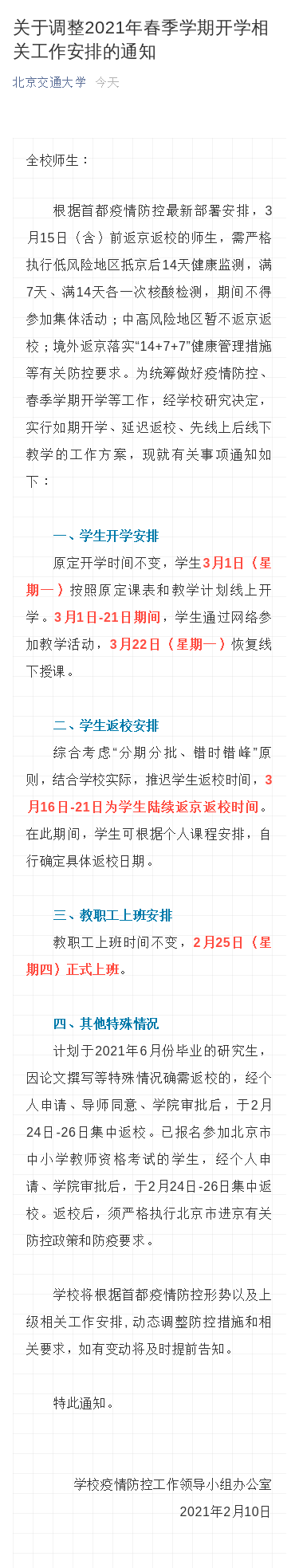 同样是在2月10日,北京交通大学发布关于调整2021年春季学期开学相关工作安排的通知。通知提到,根据首都疫情防控最新部署安排,经学校研究决定,实行如期开学、延迟返校、先线上后线下教学的工作方案。