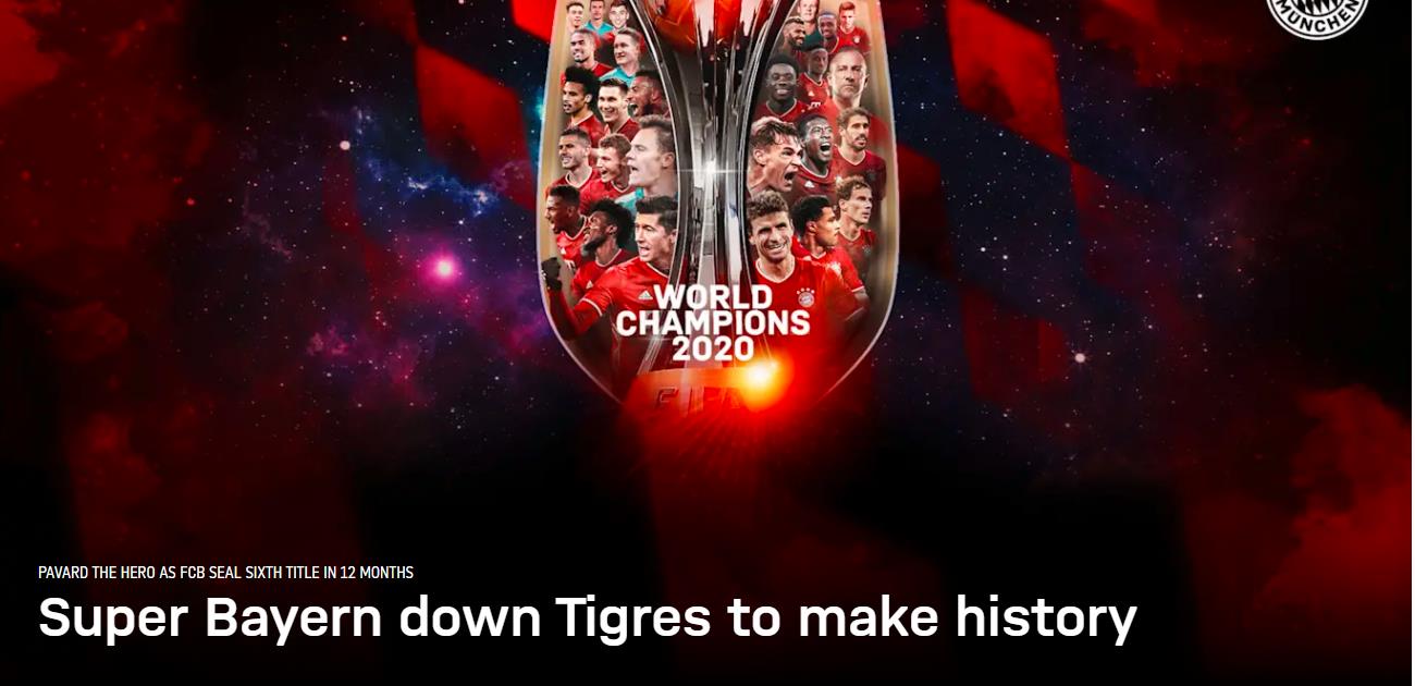 北京时间2月12日凌晨,2020年世俱杯决赛在卡塔尔多哈展开较量,凭借法国后卫帕瓦尔的进球,拜仁1比0击败墨西哥老虎队,夺得冠军。这也是拜仁继德甲冠军、德国杯冠军、欧冠联赛冠军、欧洲超级杯冠军、德国超级杯冠军之后,在2019至2020赛季拿下的第六座冠军奖杯。