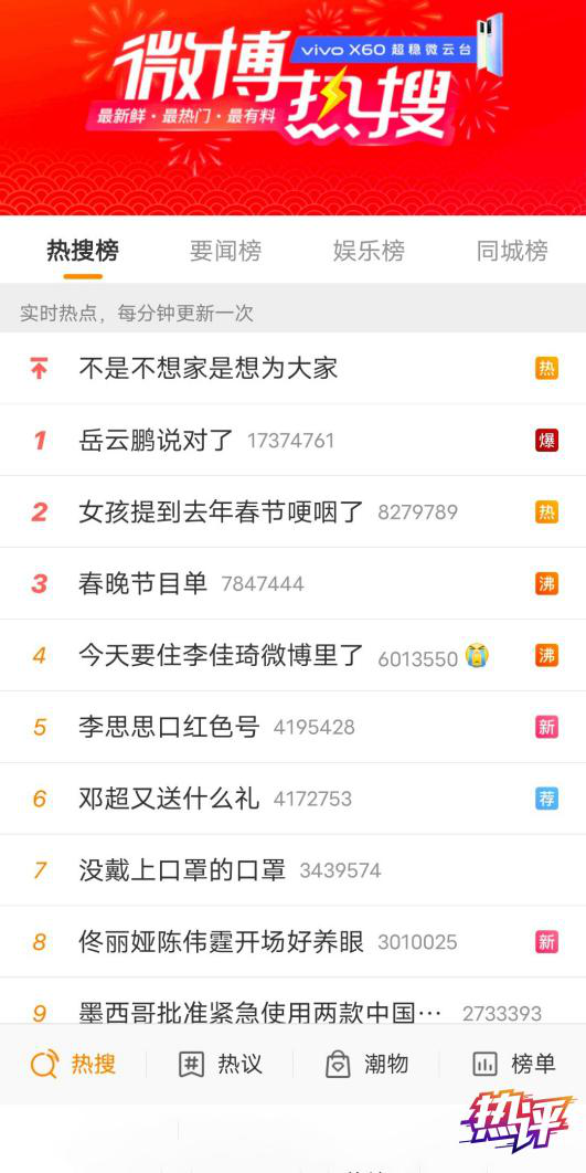 这不,除夕晚上八点准时登场的牛年春晚,开播还不到一个小时的时候,就有十多个相关话题前赴后继地冲上了热搜。在此后的几个小时里,“陪你看春晚”“春晚红口罩”“春晚节目单”“牛年春晚表情包大赛”“明天会更好 经典就是经典”“成龙是去劝架的吧”“王源都长大了月亮姐姐还没老”等春晚话题,一直都处于被热议的状态。