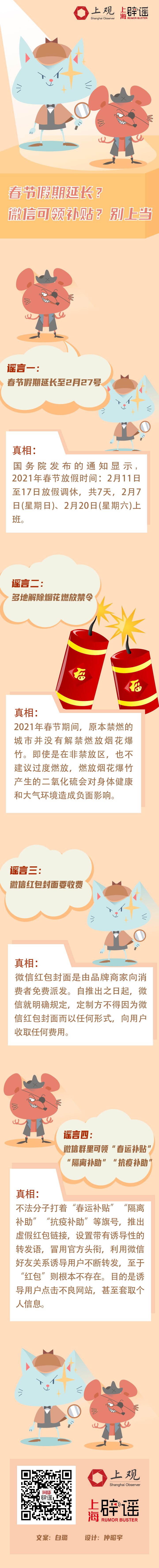 牛年春节到来,有关春节假期、红包、补贴等谣言又流传了起来。上海辟谣平台将相关谣言整合如下,大家可千万别上当。