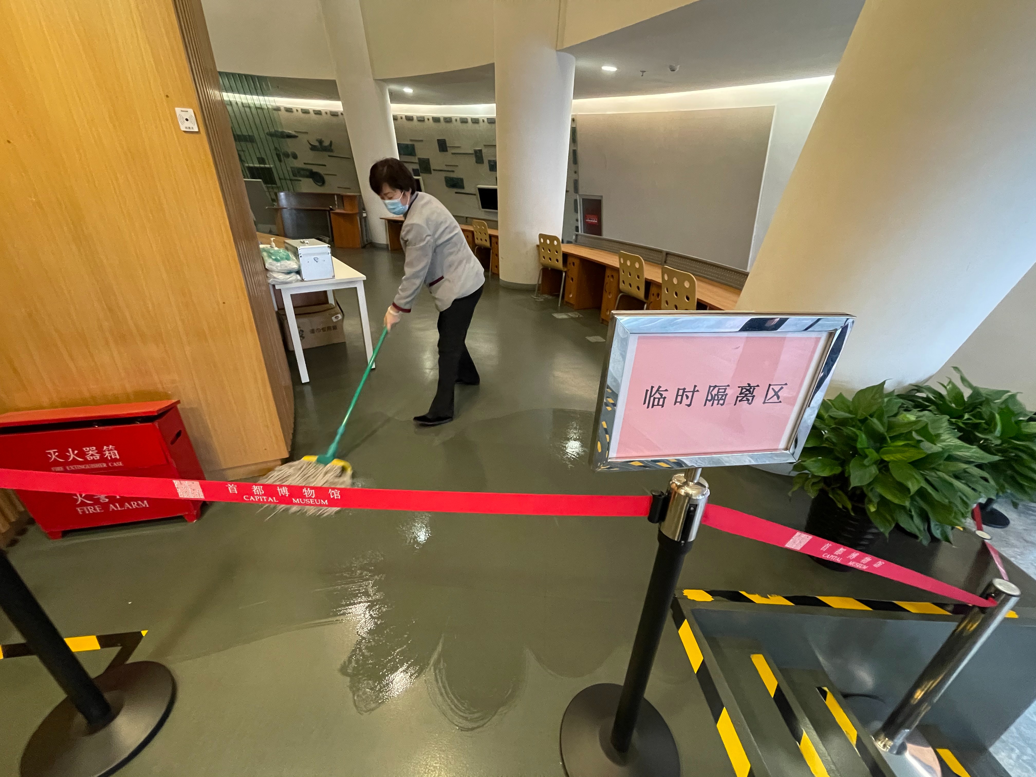 走进首都博物馆的大厅,多功能厅门口的休息区如今已变成临时隔离区,每两个小时就要消毒一次,空气中总能闻到消毒水的味道。隔离区内摆放着两套防护服、额式测温枪、水泥温度计等,墙上还贴着西城区疾控中心等单位的电话。