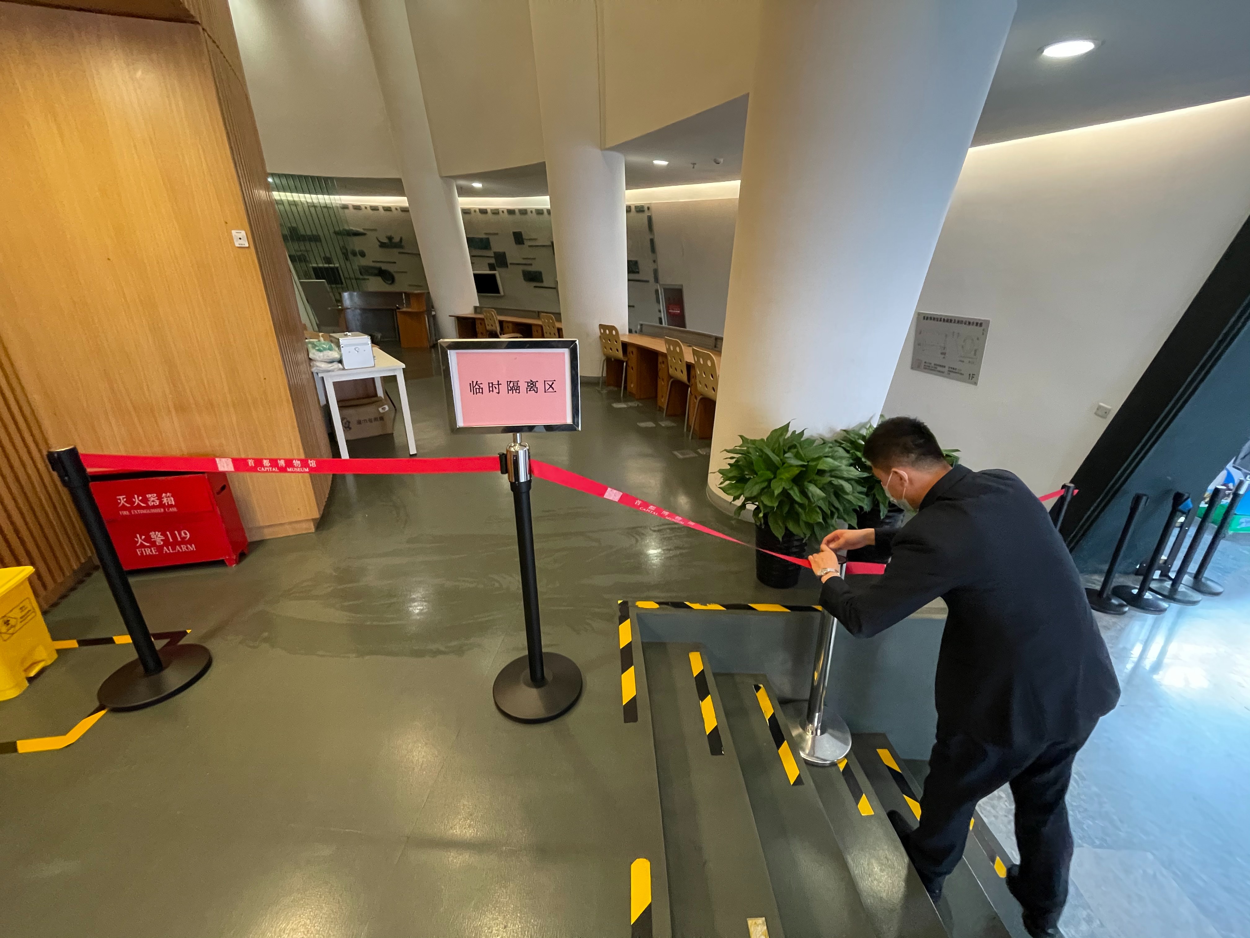 “报告经理,一层大厅出现一位体温异常游客,体温复查为38度。”首都博物馆大厅内,一名工作人员手持对讲机报告着,旁边的长椅上坐着一位游客,看上去很虚弱。与此同时,三名保安立刻到场,用警戒线将该名乘客围起。