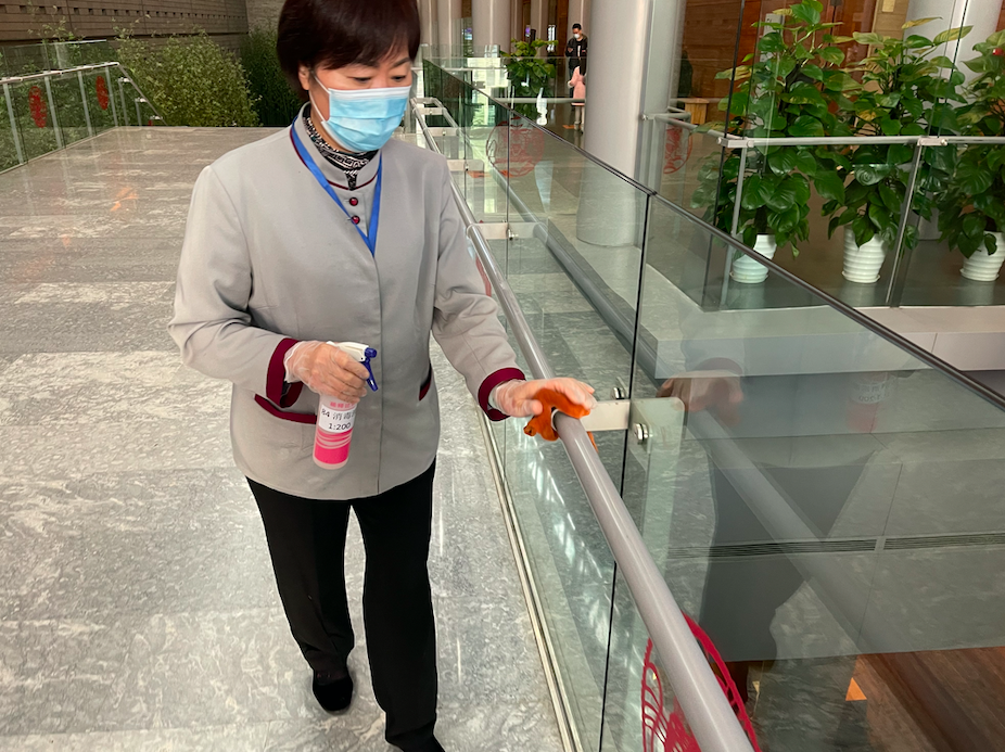 除此以外,博物馆的公共区域如走廊、展厅、卫生间等地都张贴了消毒时间表。“博物馆大部分时间是上午9点到下午4点营业,7个小时里我们就要对公共区也消毒6次。春节期间,博物馆的营业时间延长到12个小时,我们消毒至少要到8次。同时扶梯扶手、走廊把手和自助存包柜也要勤消毒。”物业副经理潘春雷说。