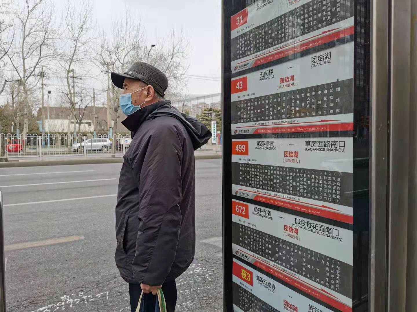 12分钟后,一辆43路车缓缓进站,记者随乘客们一起上车,刷卡后至后车厢坐下。因已是午后,车上乘客并不多。行至白家庄北站,车门开启,有乘客下车,公交车电子屏显示“下一站,中纺街”字样。两位老人边看边说“开始堵车了”,另一位马上回应:“一般6点多7点就开始堵了,坐这路车不能着急。”