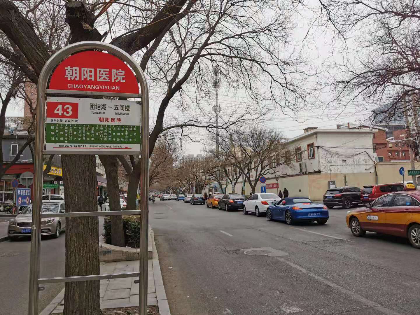随后,记者转到路对面43路首站等车,并开始该次交通体验。公交43路团结湖站站牌显示,公交首车发车时间为每日5时10分,末车时间为23时。该条线路全线共20个站点,自团结湖站始发,前3个站点依次为白家庄北、中纺街、朝阳医院站,全长1.4公里。