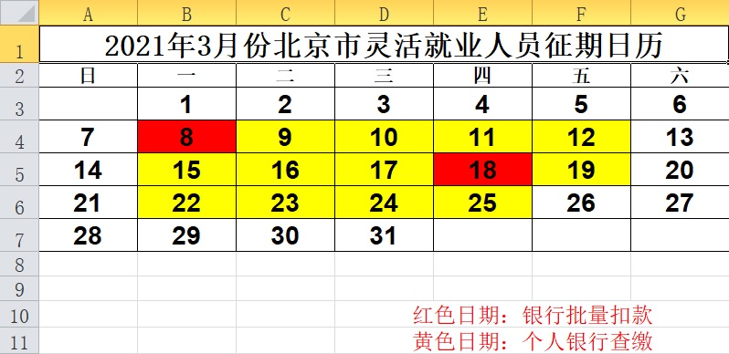 灵活就业人员2021年3月社会保险费由税务部门于3月8日、18日组织各合作银行批量扣款,请确保用于缴费的银行账户余额充足。3月9日-17日、19日-25日的工作日,中国农业银行、北京银行、中国邮政储蓄银行全市各网点均开通个人银行查询缴费业务(个人银行查询缴费业务请在当日15:00前办理)。