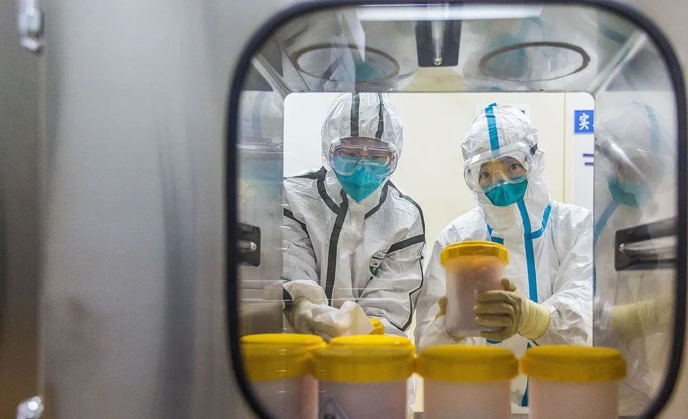 ▲工作人员在中国疾病预防控制中心接受从浙江运抵的疫苗生产用新冠病毒毒株。新华社发
