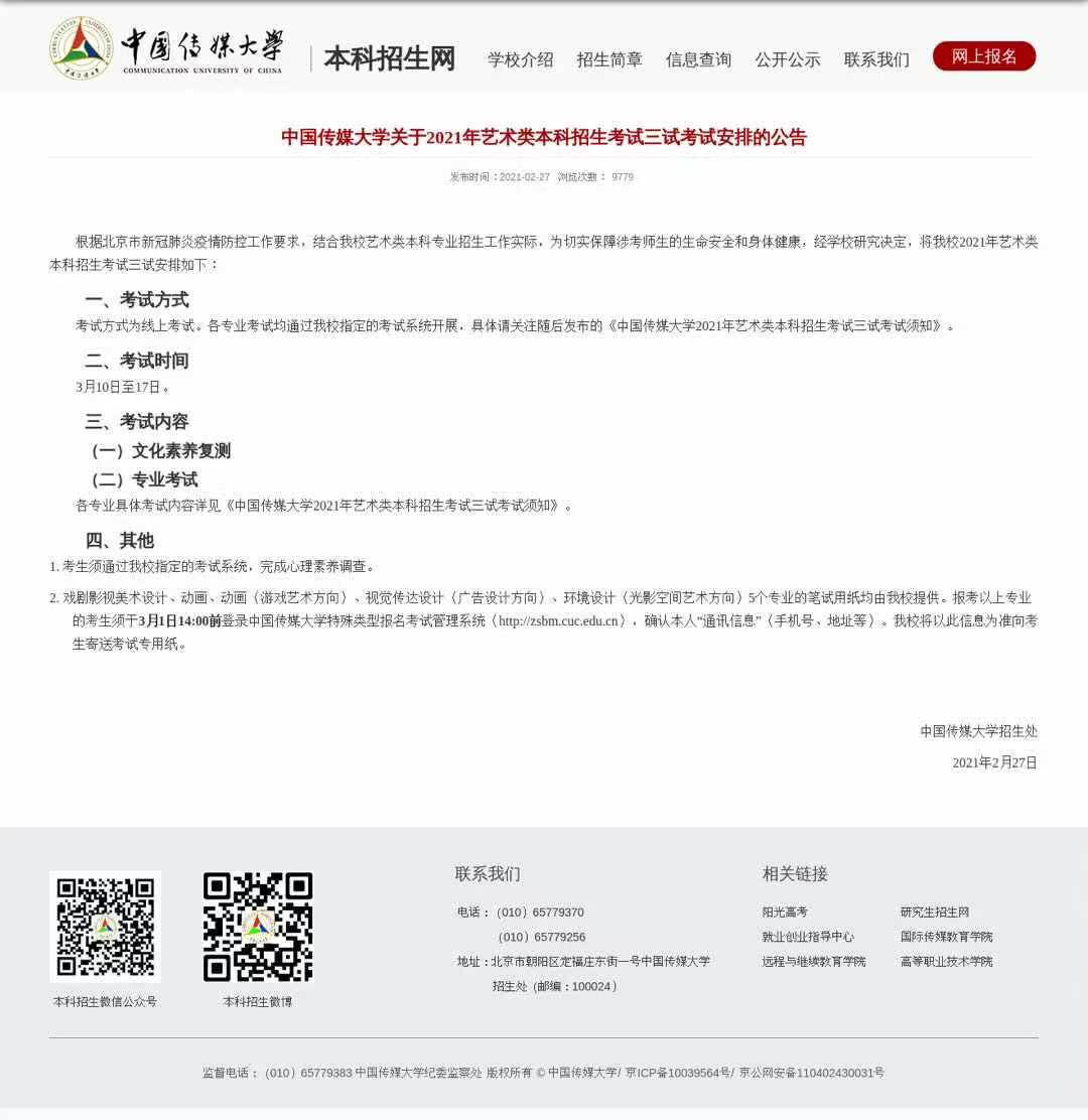 2月27日,中国传媒大学发布最新公告,2021年艺术类本科招生考试三试时间为3月10日至17日,方式为线上考试,内容包括文化素养复测和专业考试。