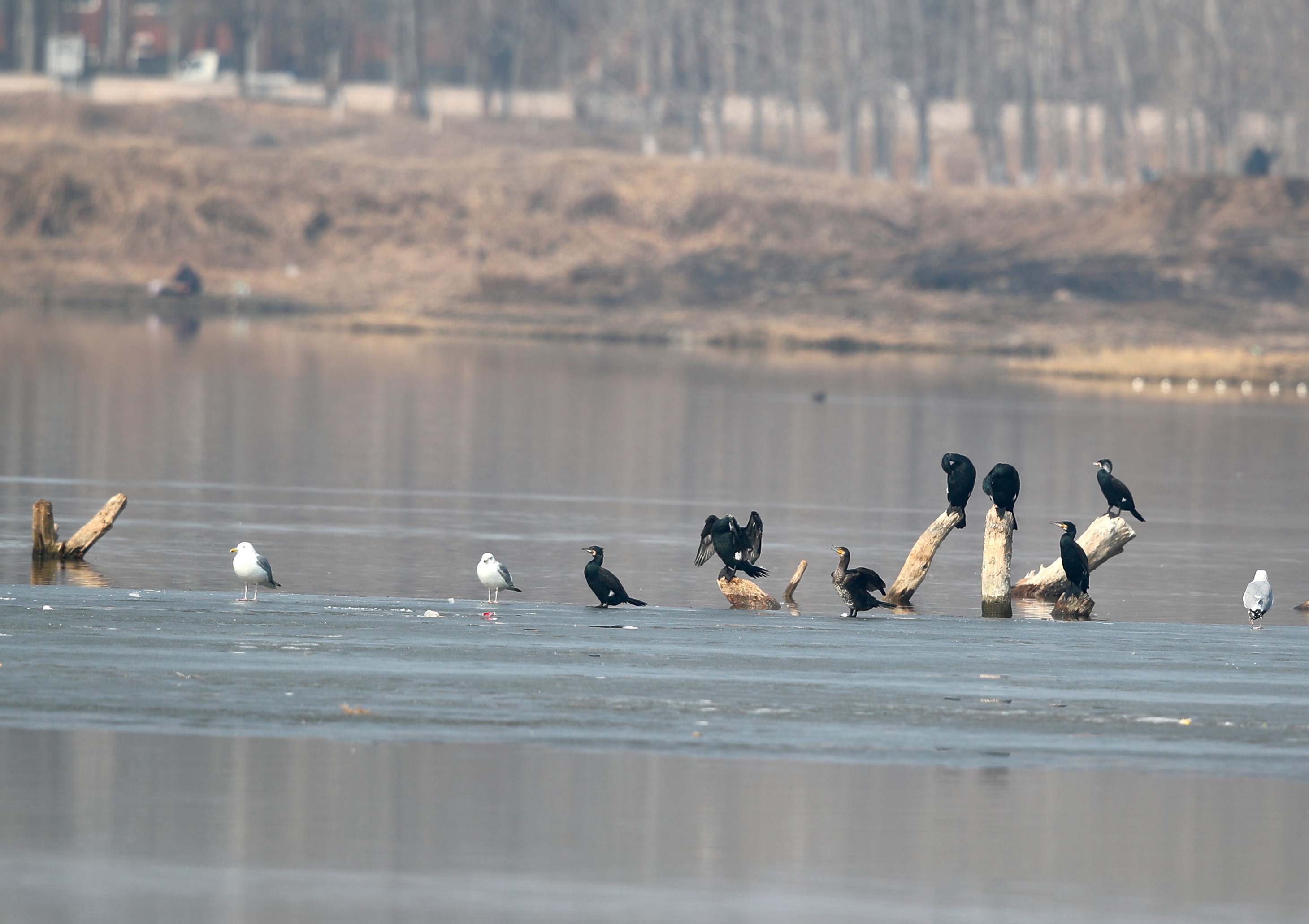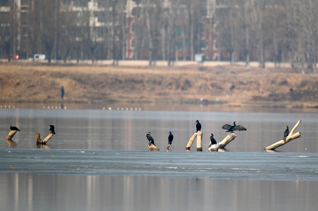 “普通鸬鹚捕鱼的时候要潜水,翅膀会湿。一般潜水上来后,它们要站在树杈上打开翅膀晾晒,晒干了才能起飞。不走的,都是翅膀还没晾干呢!”北京黑豹野生动物保护站站长李理笑着解释。