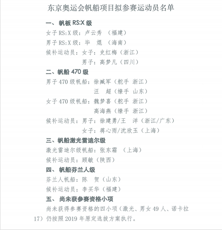 目前,国家帆船帆板队已经取得了东京奥运会男、女帆板RS:X级,男、女帆船双人艇470级,女子帆船激光雷迪尔级、男子帆船单人艇芬兰人级共6个项目的奥运参赛资格。