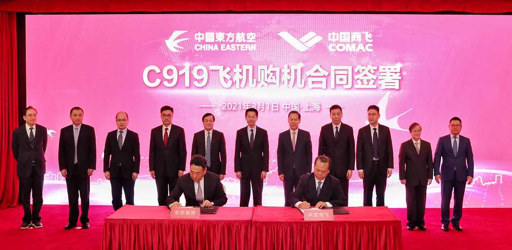 2021年3月1日,中国东方航空作为国产大飞机C919全球首家启动用户,与中国商飞公司在上海正式签署了C919大型客机购机合同,首批引进5架,东航将成为全球首家运营C919大型客机的航空公司。这是东航继成功组建一二三航空公司运营国产ARJ21飞机之后,在国产大飞机的引进与商业运营上迈出的重要一步。