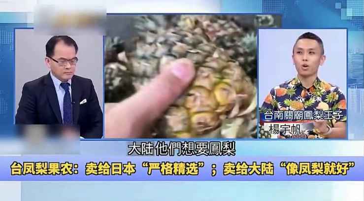 杨宇帆3月1日在政论节目中提到,台湾凤梨出口日本与大陆的差别,他认为出口日本价格虽然好,但对方要求也较为严格,出口大陆则是“赚快钱”,“他们对品质的要求其实是没那么高的”。他说:“有时候我们会开玩笑,他们想要凤梨,看起来像凤梨就好,我今天吃菜头,我把它用成像凤梨,他们可能也会要”。