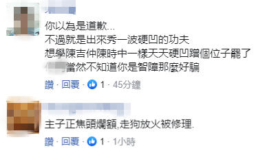 对于他的“道歉”,有岛内网友并不认同,称“你以为是道歉...不过就是出来秀一波硬凹的功夫,想学陈吉仲陈时中一样天天硬凹蹭个位子罢了。”“主子正焦头烂额,走狗放火被修理。”