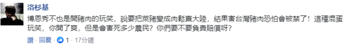 也有网友提到,“博恩秀不也是开猪肉的玩笑,说要把莱猪变成肉松卖大陆,结果害台湾猪肉恐怕会被禁了!这种混蛋玩笑,你开了爽,但是会害死多少农民?你们要不要负责赔偿呀?”